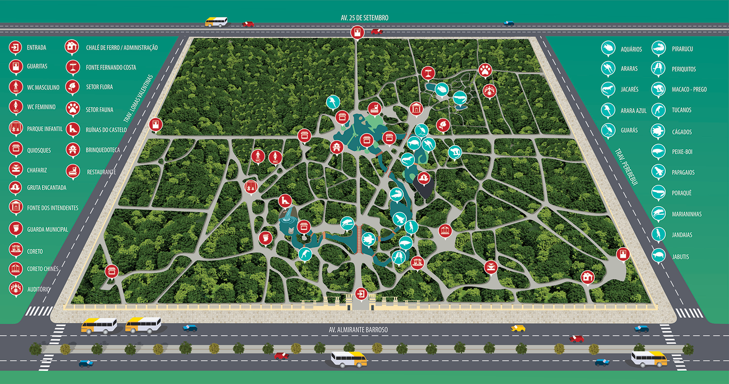 O Bosque abriga uma importante diversidade de espécies da fauna e flora do ecossistema amazônico além dos monumentos das grutas, aquários chalés e viveiros.